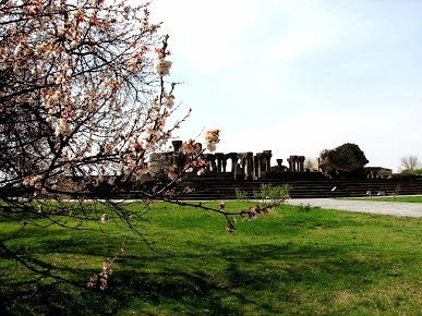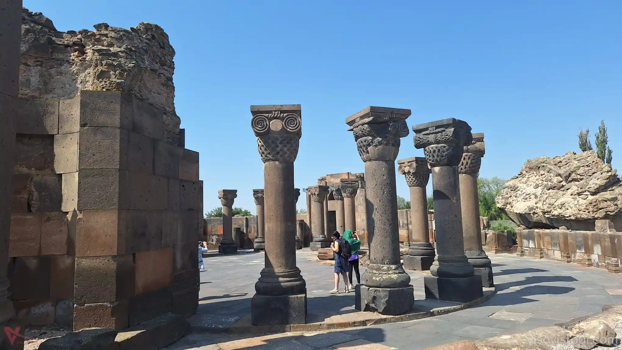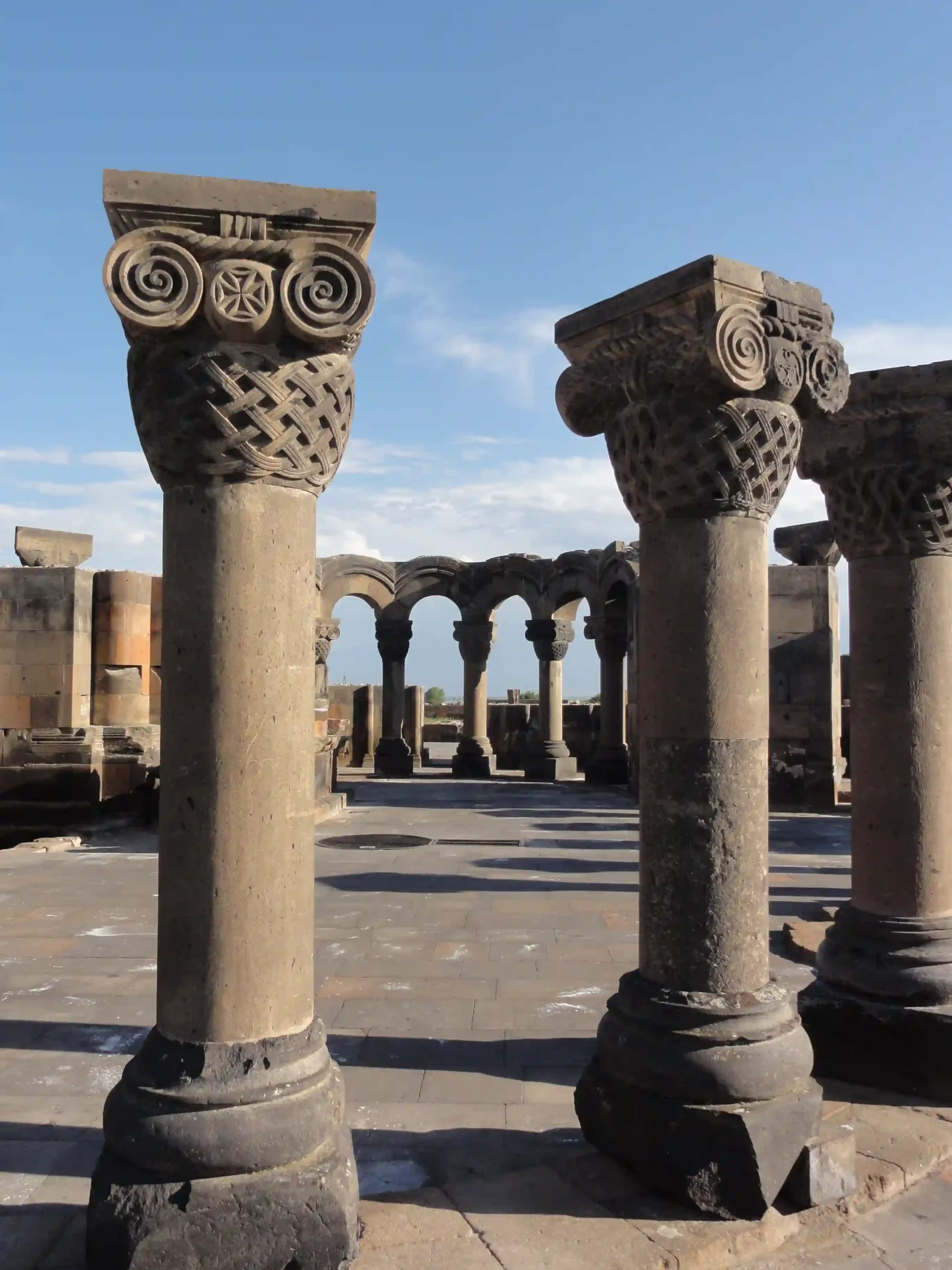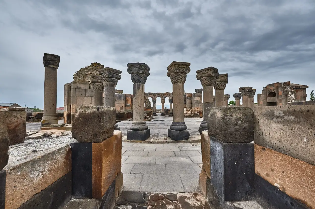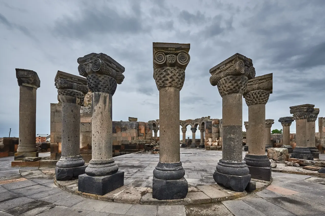 The Zvartnots Archaeological Site represents a unique example of early Christian Armenian architecture, featuring a design composed of three polyhedrons. The structure is supported by massive pillars adorned with intricate carvings of eagles and embellished with motifs of grapevines and pomegranate twigs.