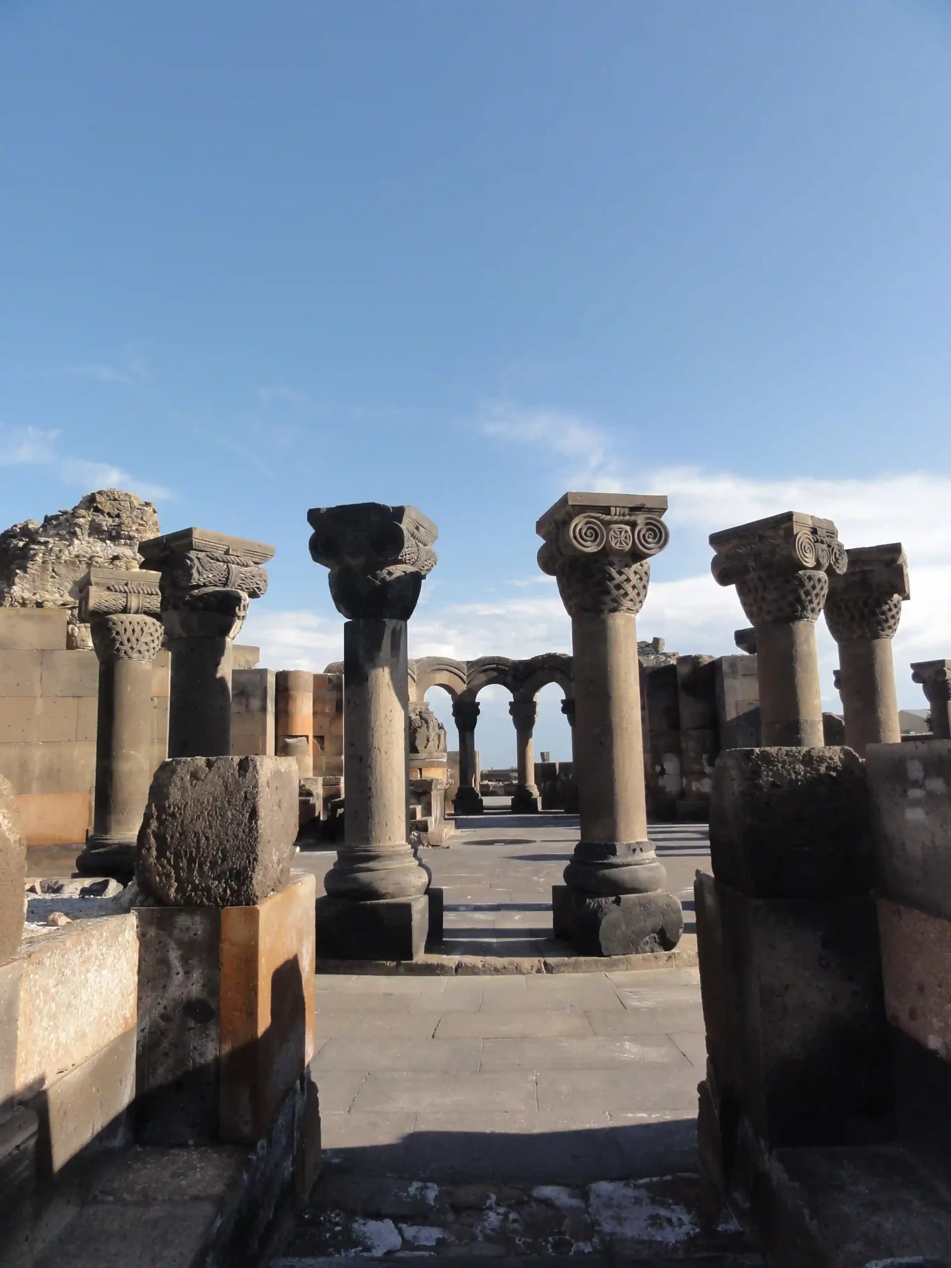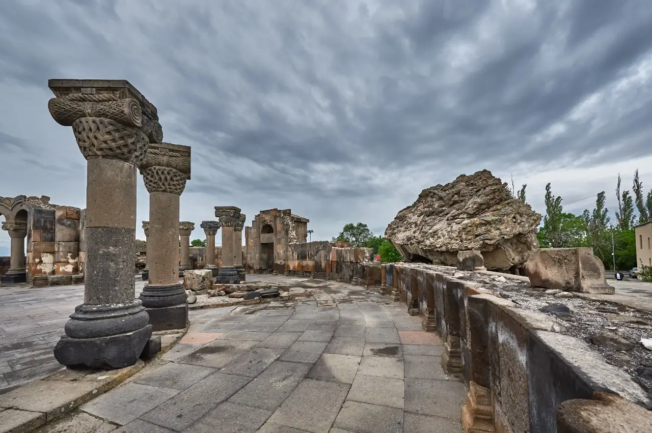 Zvartnots, a remarkable temple dedicated to the Vigil Forces, was constructed between 641 and 661 A.D. as Armenia’s main cathedral under the direction of Catholicos Nerses III. This architectural masterpiece is one of the wonders of early Christian architecture in Armenia. Although the cathedral suffered damage from an earthquake in the 10th century, the ruins still convey its extraordinary beauty.