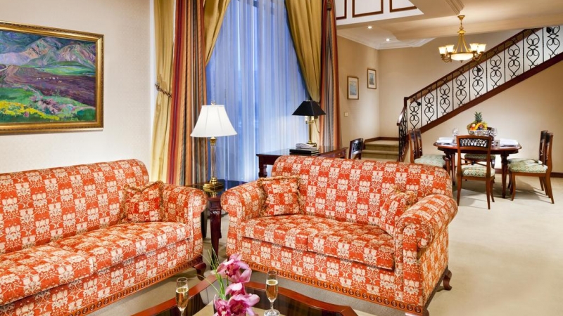 Behind its grand façade, the Marriott Armenia Hotel Yerevan provides spacious rooms and suites with flat-screen TV, minibar, and seating area. Guests enjoy views of Mount Ararat or Republic Square.