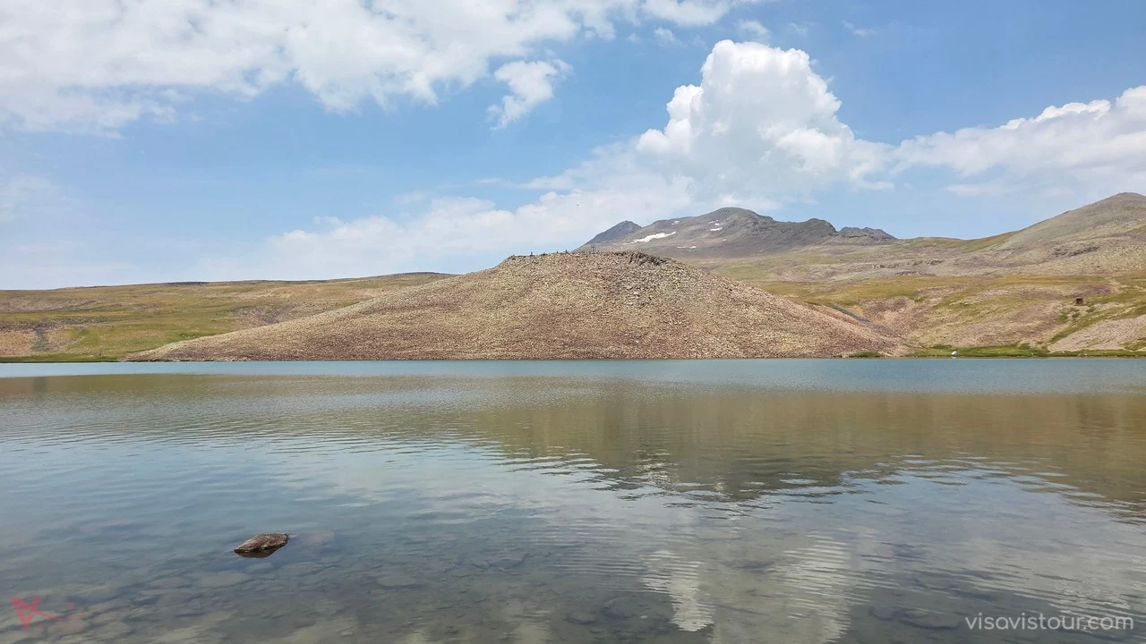 Поездка к высокогорному озеру Кари, расположенному в кратере между четырьмя острыми вершинами горы Арагац на высоте 3207 м над уровнем моря. Узкая горная дорога с обрывами по одну сторону поднимается выше и выше к озеру ледникового происхождения.