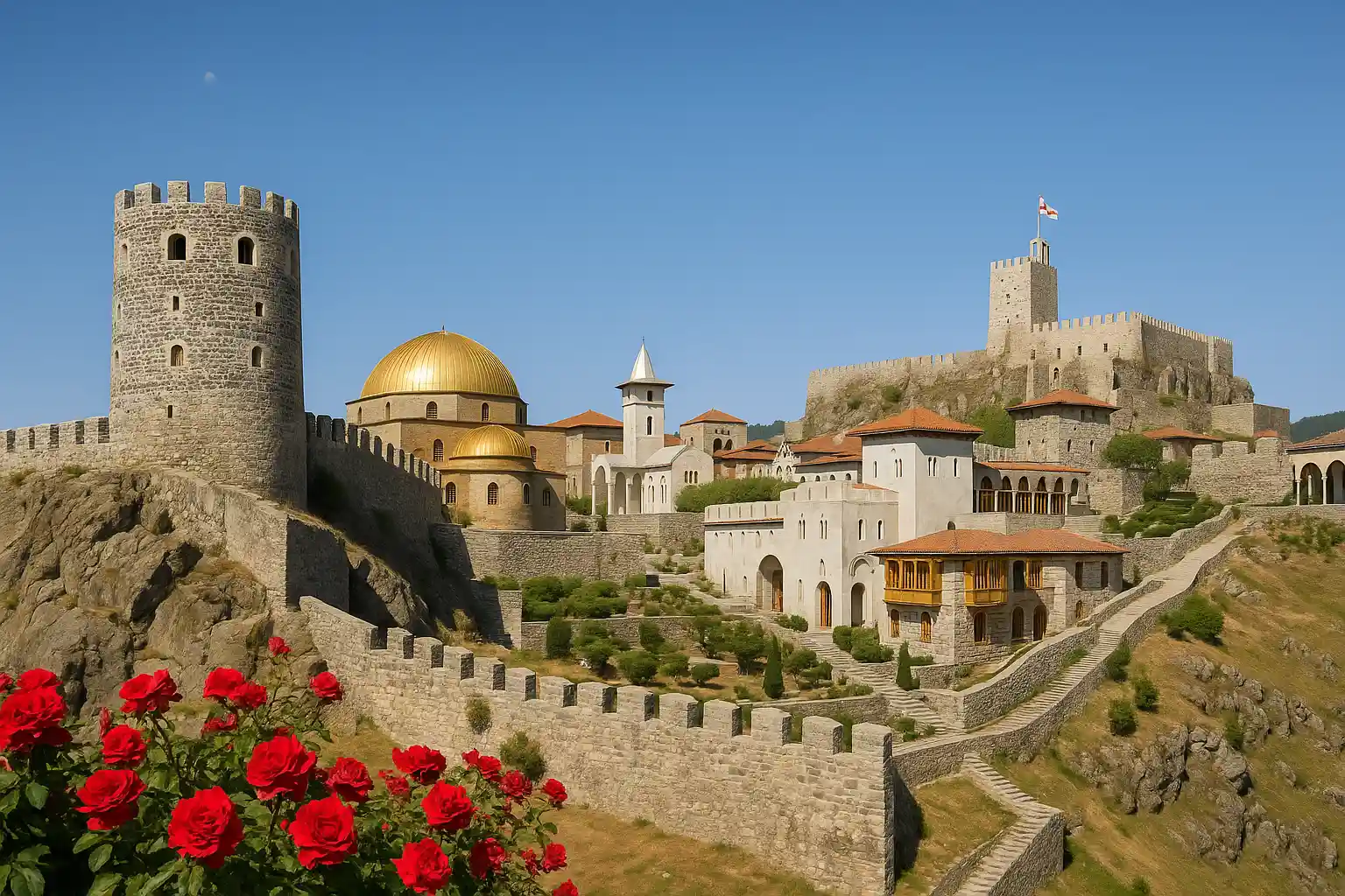 Svetitskhoveli Cathedral (11th Century) – Known as the “Pillar of Life,” this monumental cathedral is believed to be the burial place of Christ’s robe. With its high stone walls, beautifully preserved frescoes, and sacred status, it remains one of Georgia’s most revered Orthodox churches.