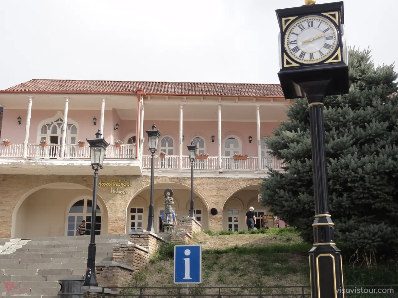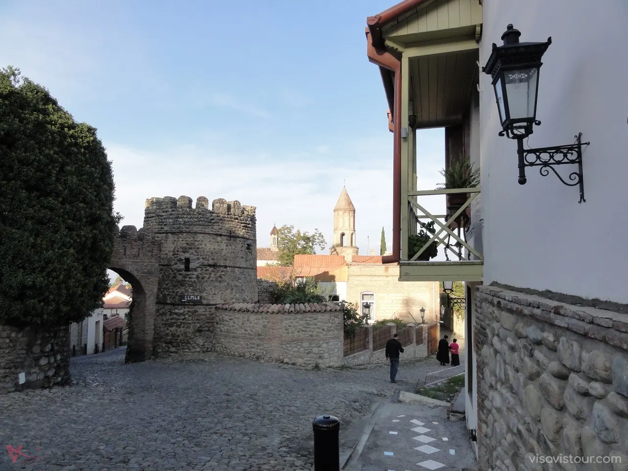 Wander through the cobblestone streets, lined with pastel-colored wooden balconies and traditional Georgian houses.